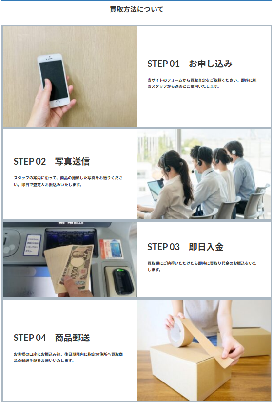 | 買取方法 | 写真で即時買取(先払い買取) |