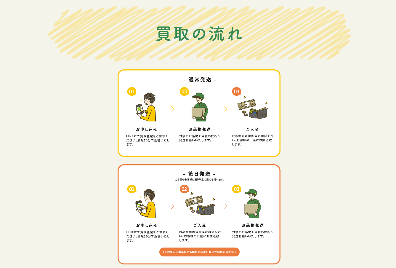 - 買取代金をお振込み後、発送期限までに買取商品を指定の住所へ郵送ください。