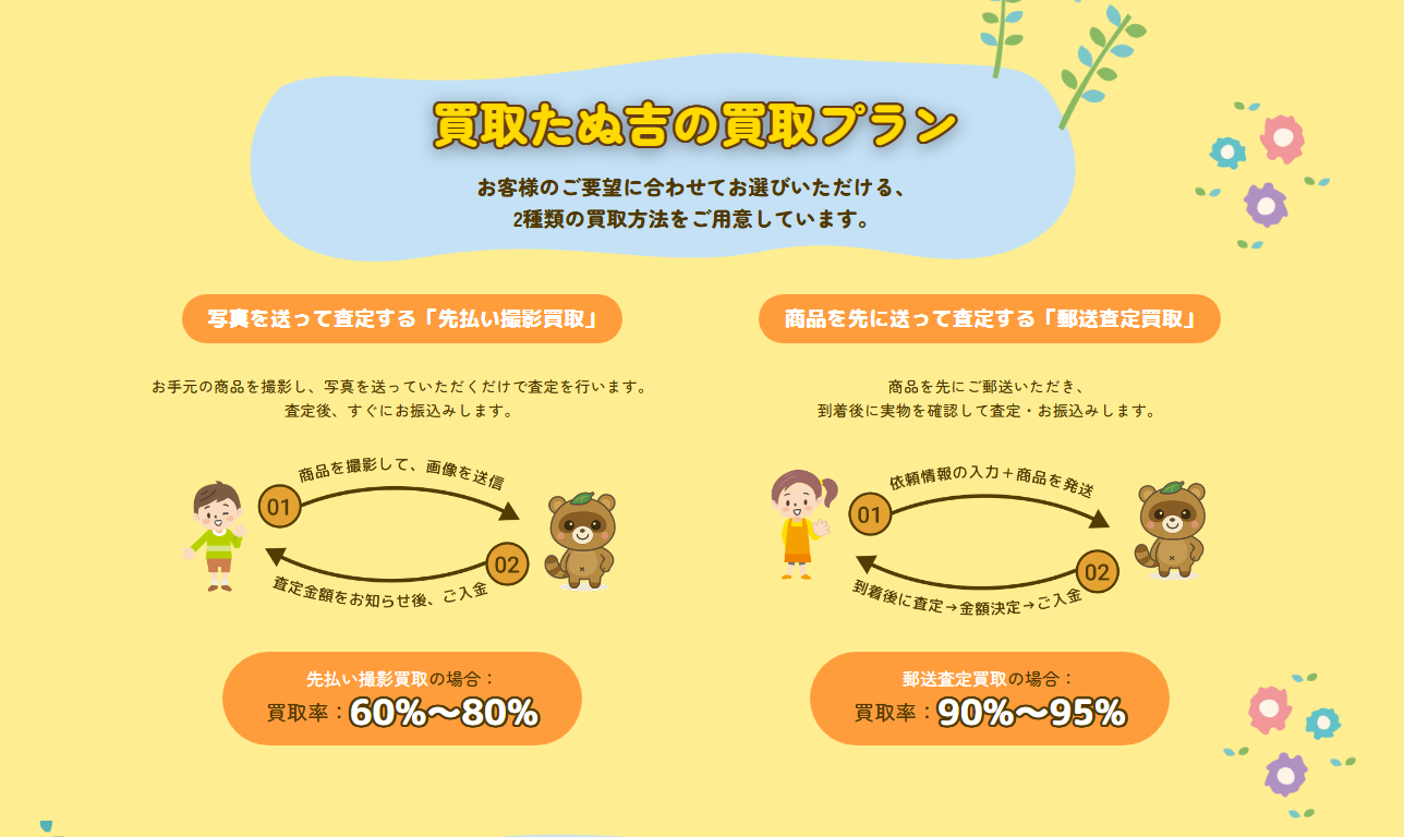 『買取たぬ吉』は、買取金額の先払いと後払いの2プランの買取方法がございます。お客様のタイミングに合わせた方法で買取が可能となります。