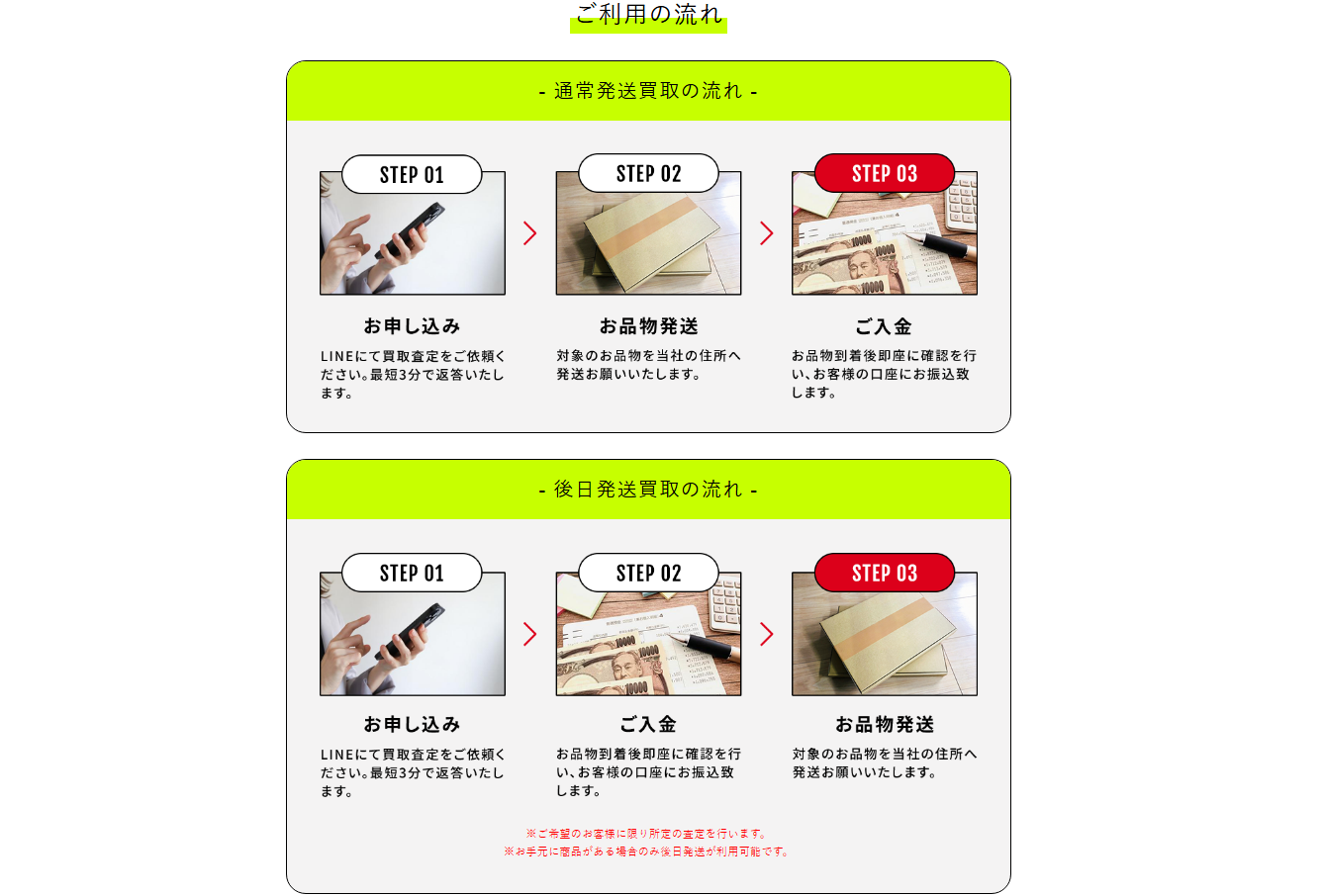 | 買取方法 | 写真で即時買取(先払い買取)・郵送買取 |