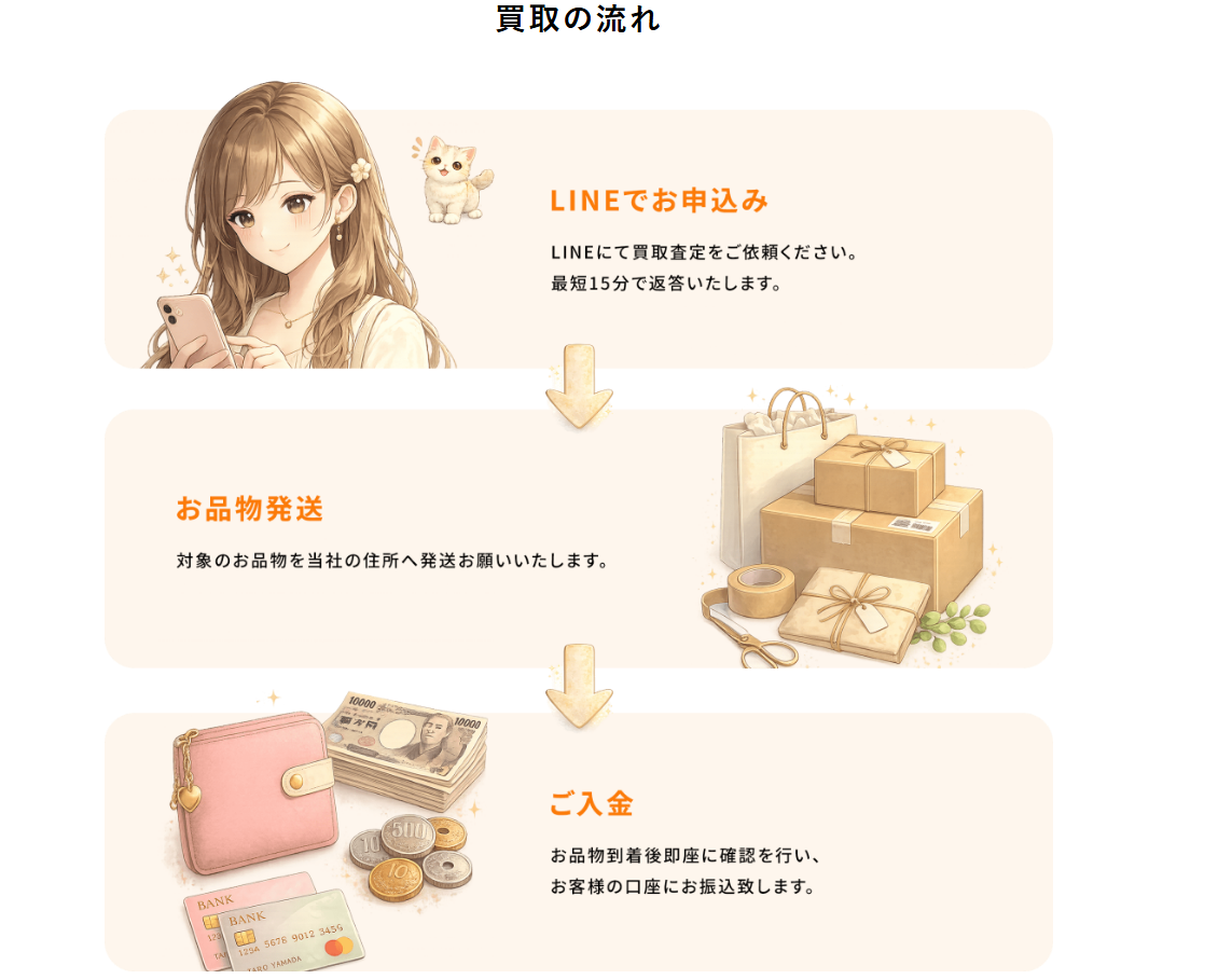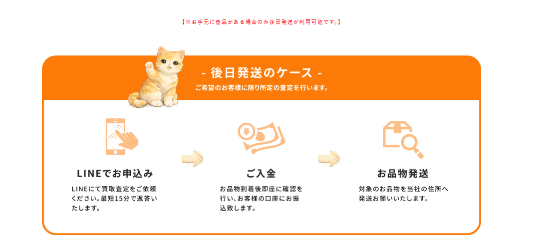 - 買取代金をお振込み後、発送期限までに買取商品を指定の住所へ郵送